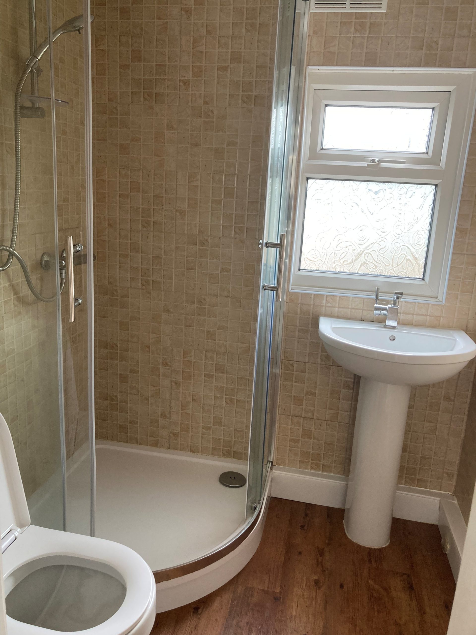 Newly refurbished shower room fully tiled.